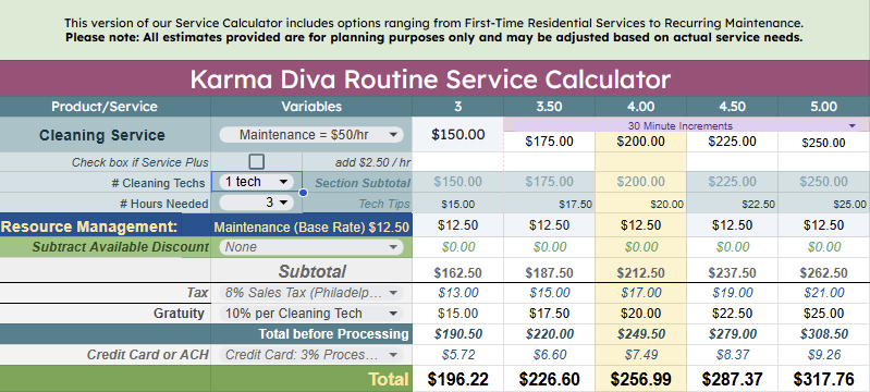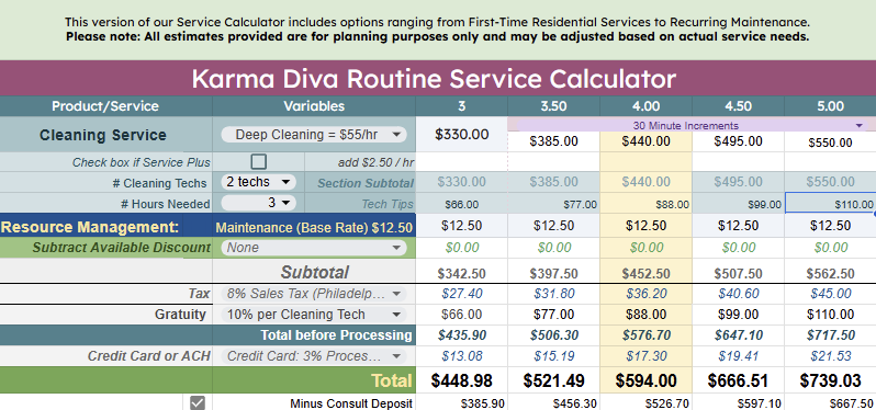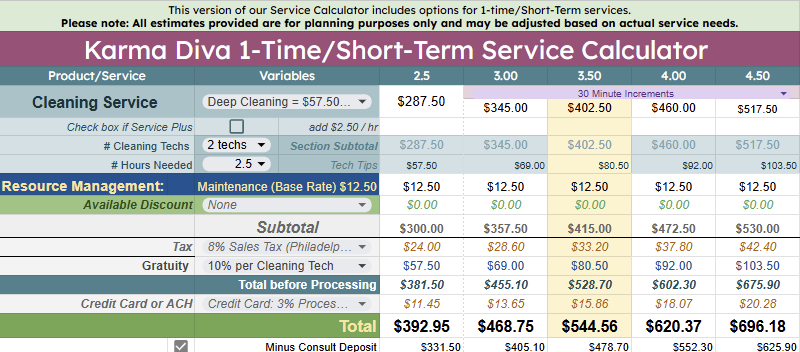 First Service Deep Cleaning: Typical for an Initial First Service, this shows example rates for 3-5 hours of deep cleaning with 2 service professionals. This calculator offers a clear image of exactly what is being charged, with options to toggle different preferences.